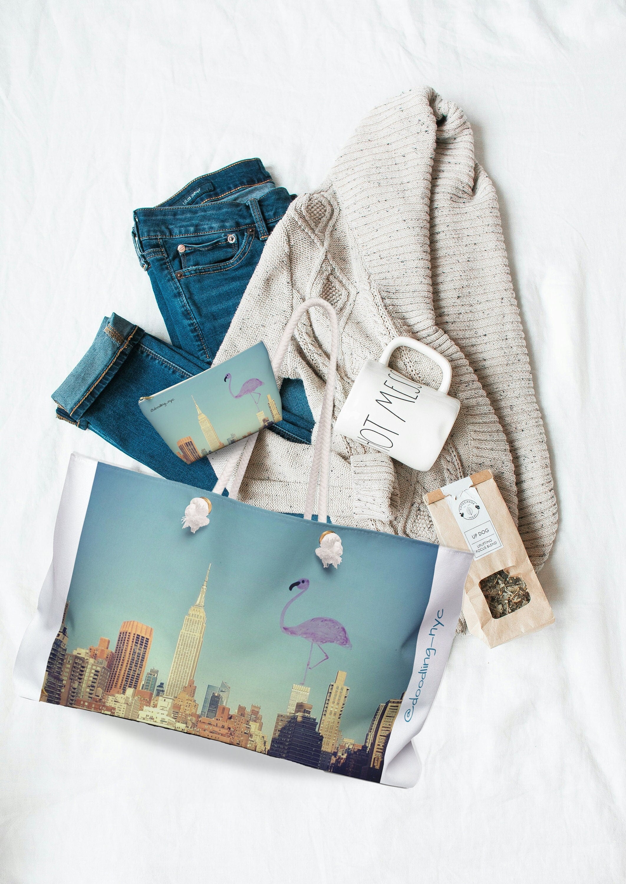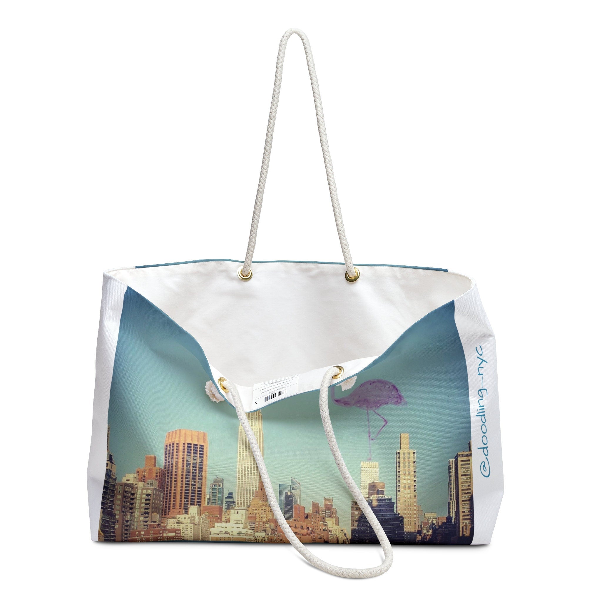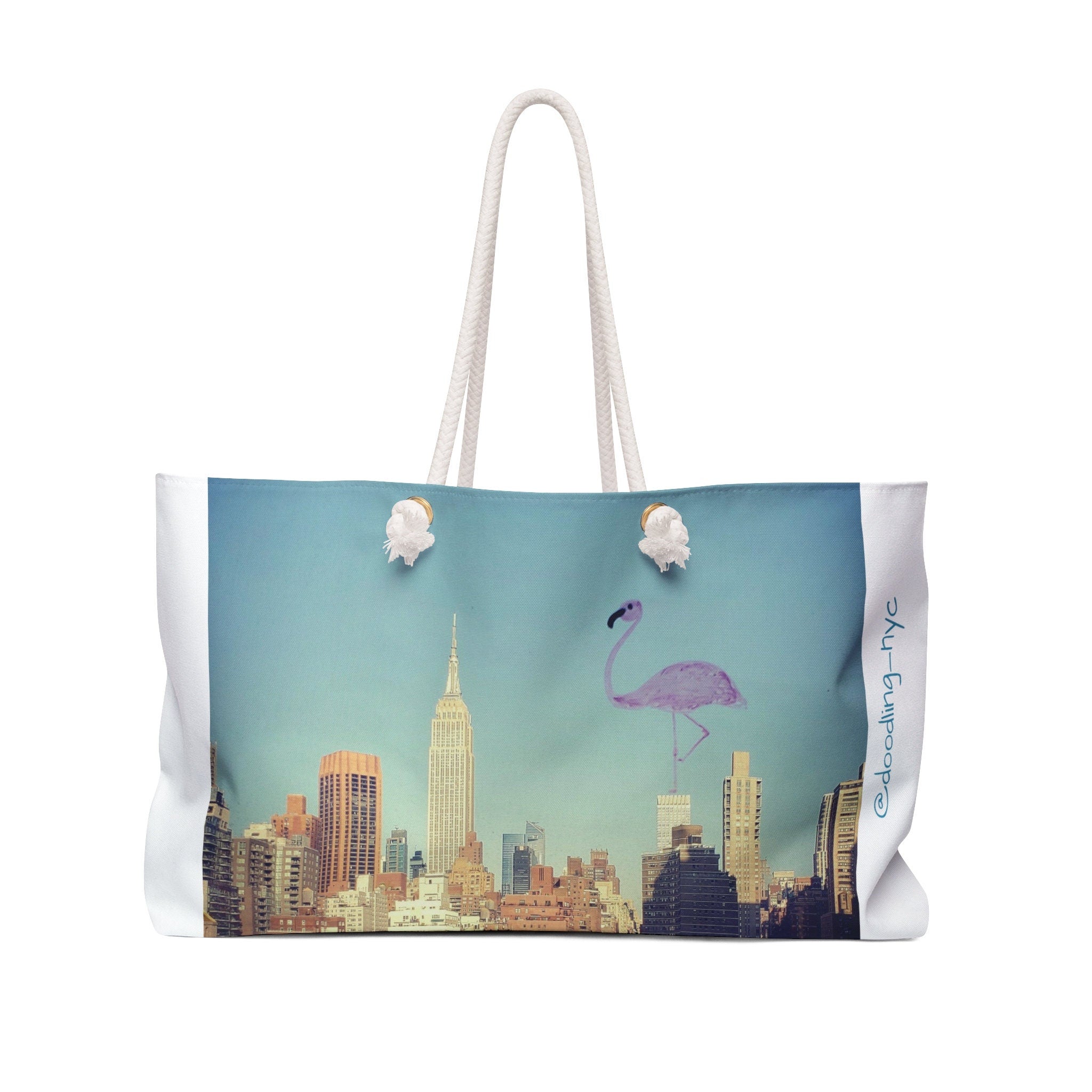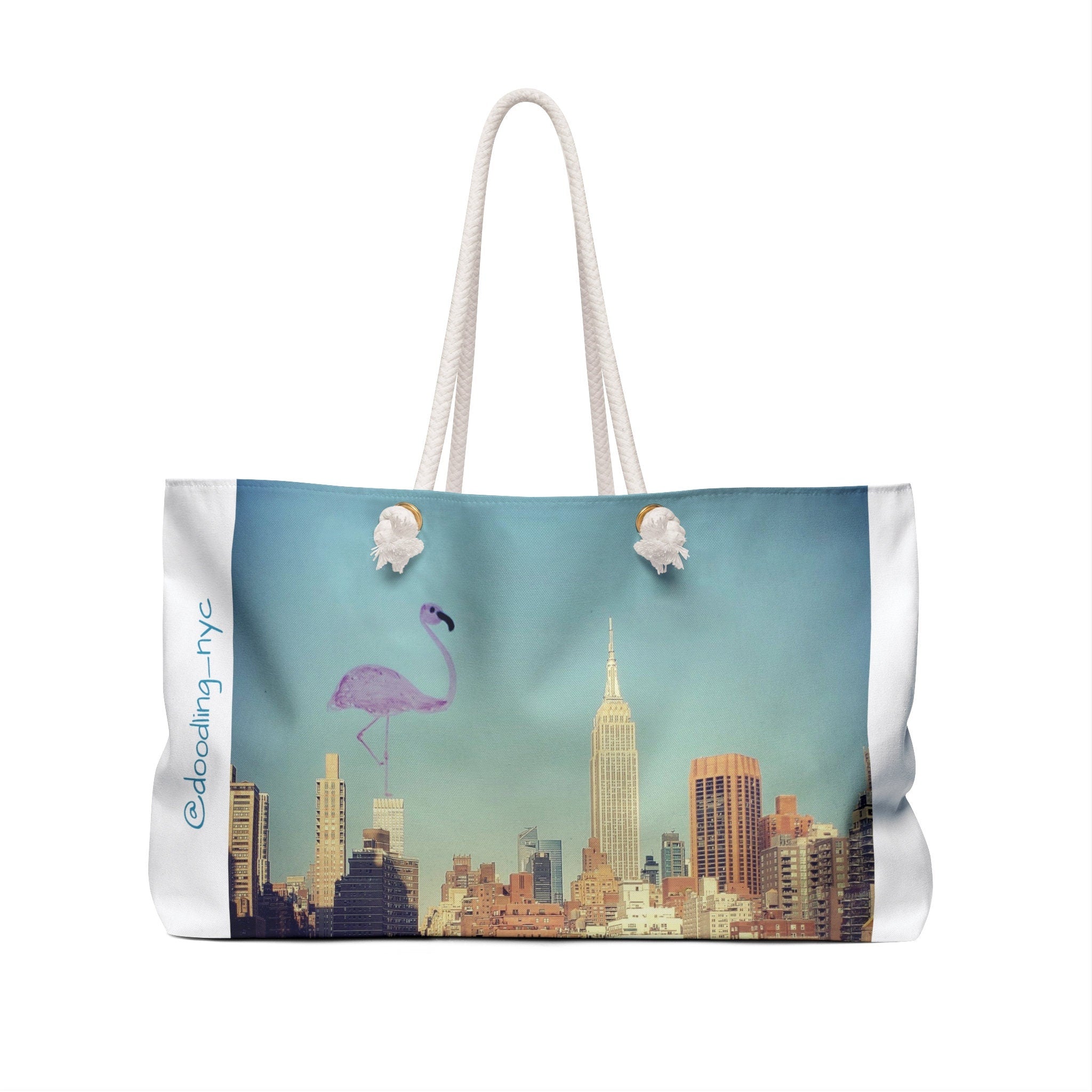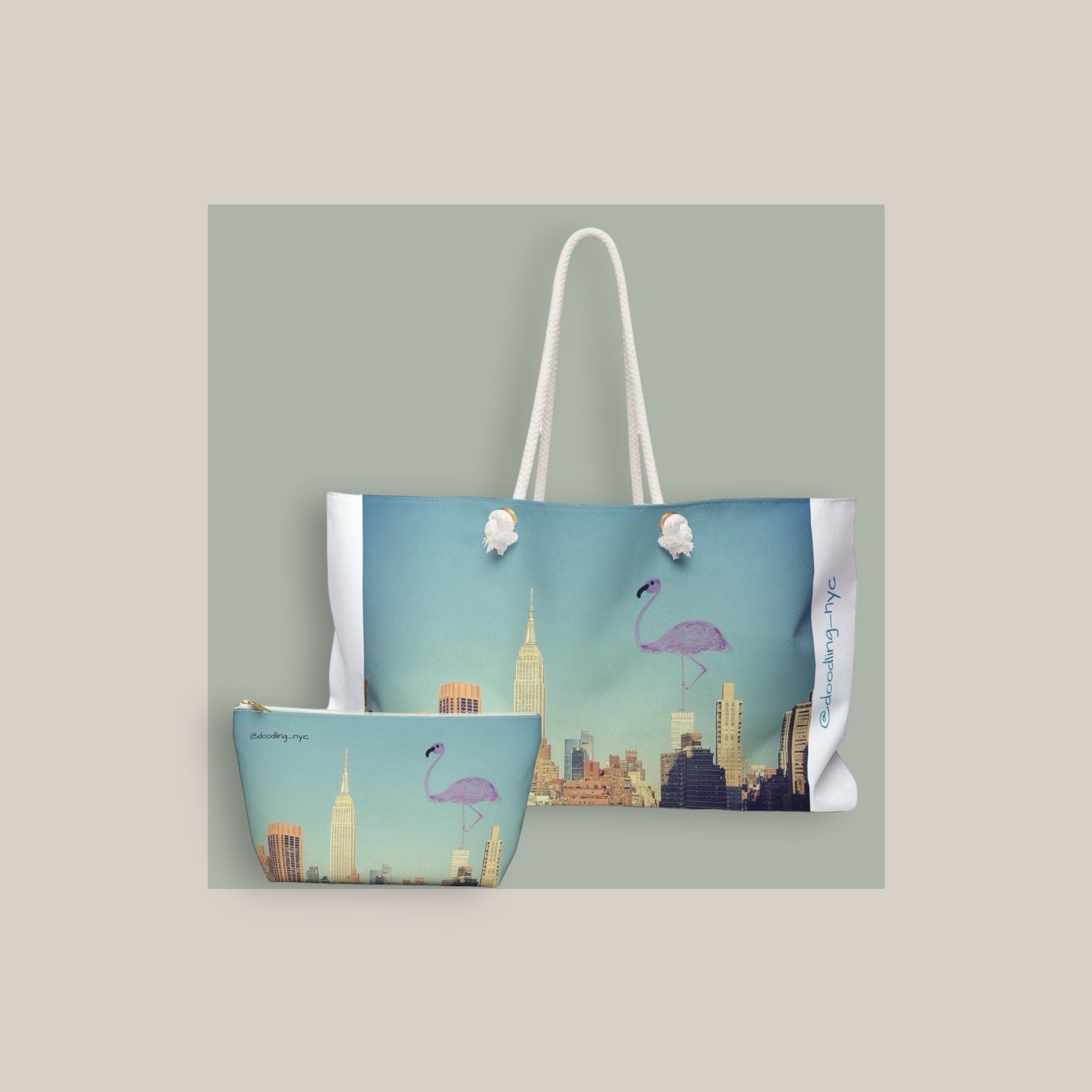 Pink Flamingo Weekender Tote Bag & Pouch Set, All Purpose Weekend Tote Bag, Beach Travel Bag, Diaper Market Bag, NYC Skyline Accessory Bag