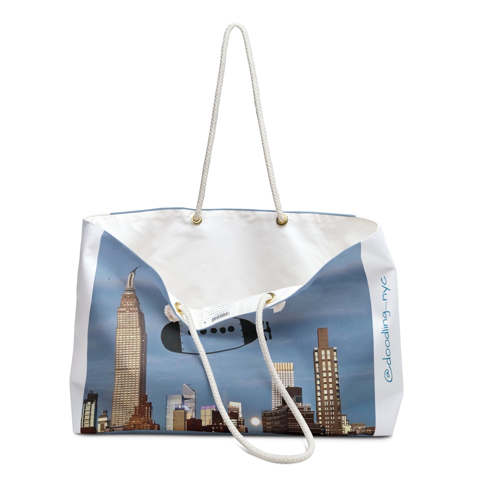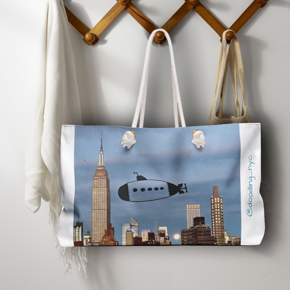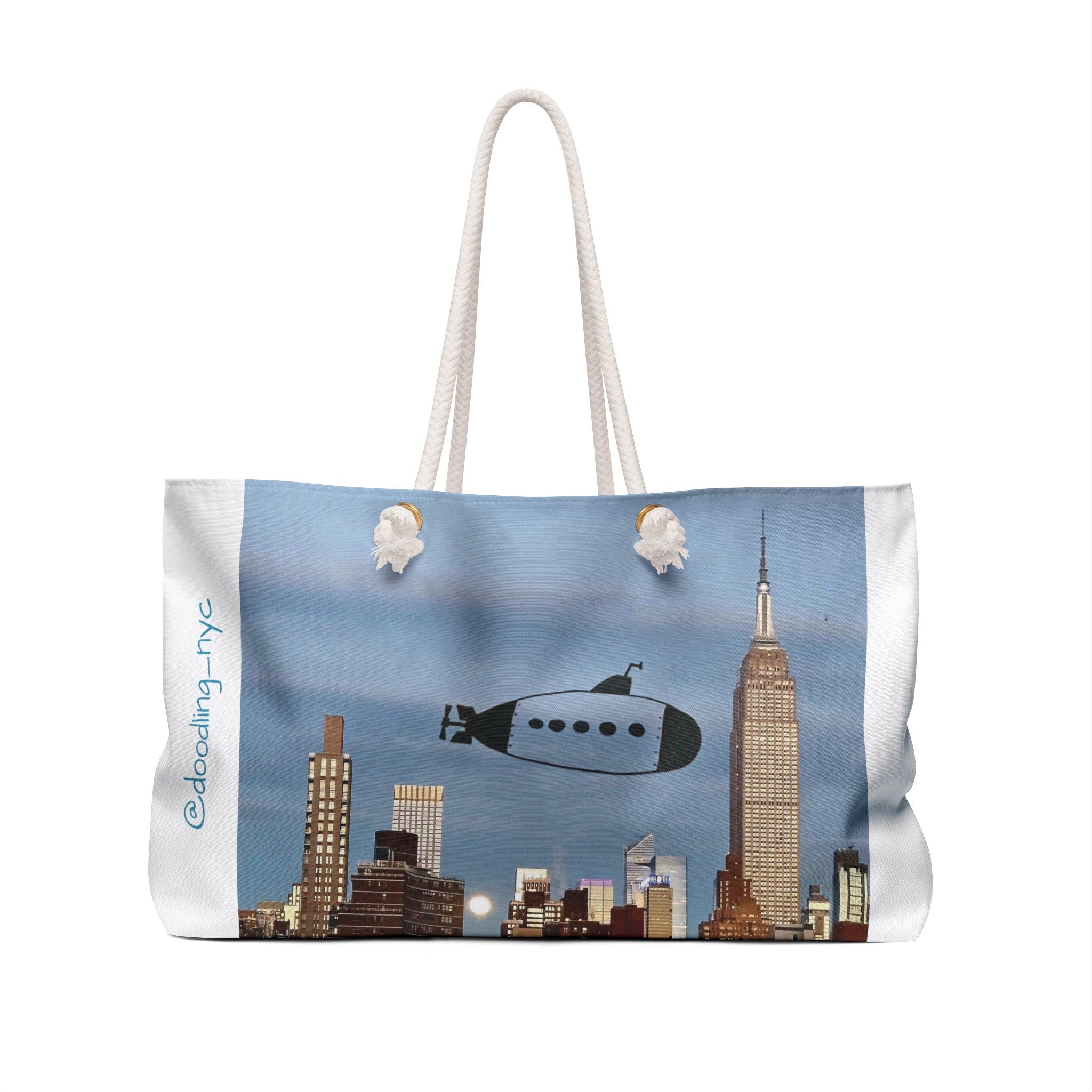 Hand Drawn Submarine Doodle Weekender Tote Bag, NYC Skyline Beach Bag, Large Tote Weekend Travel Bag, Everything Shopper Bag, Statement Tote