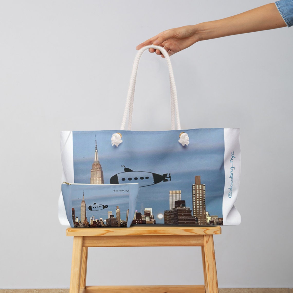 Hand Drawn Doodle Weekender Tote Bag & Makeup Pouch Bag Set, Artsy Weekend Beach Bag, Large Tote Travel Bag, Everything Bag, Travel Gift