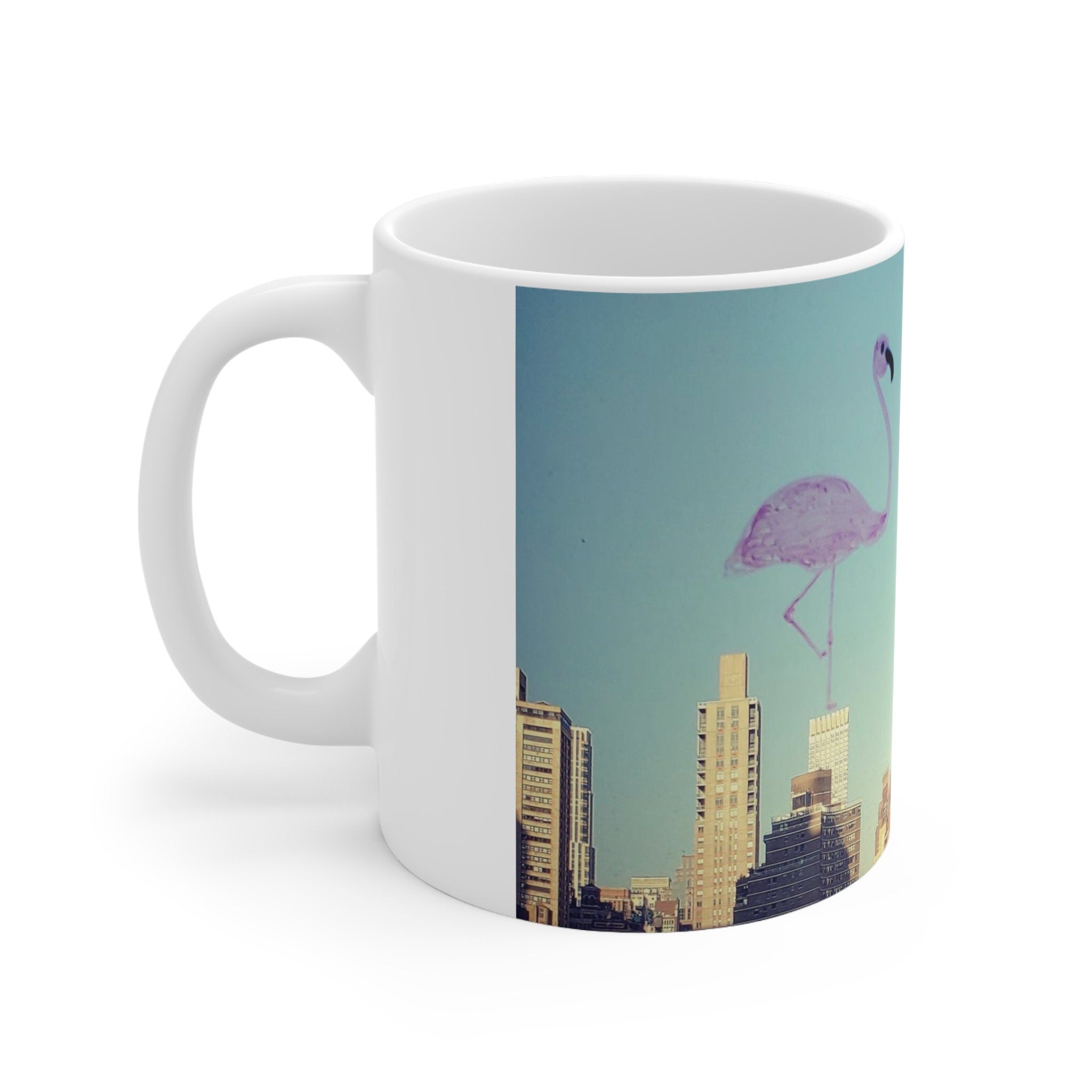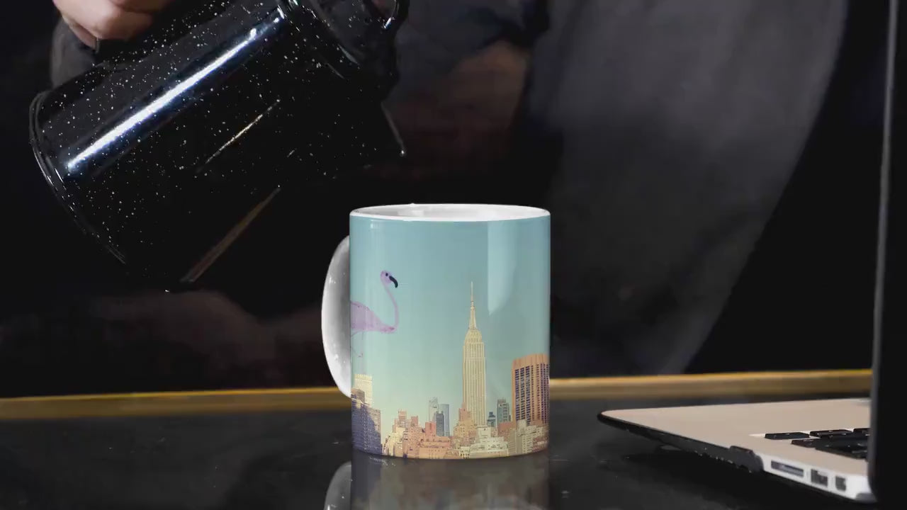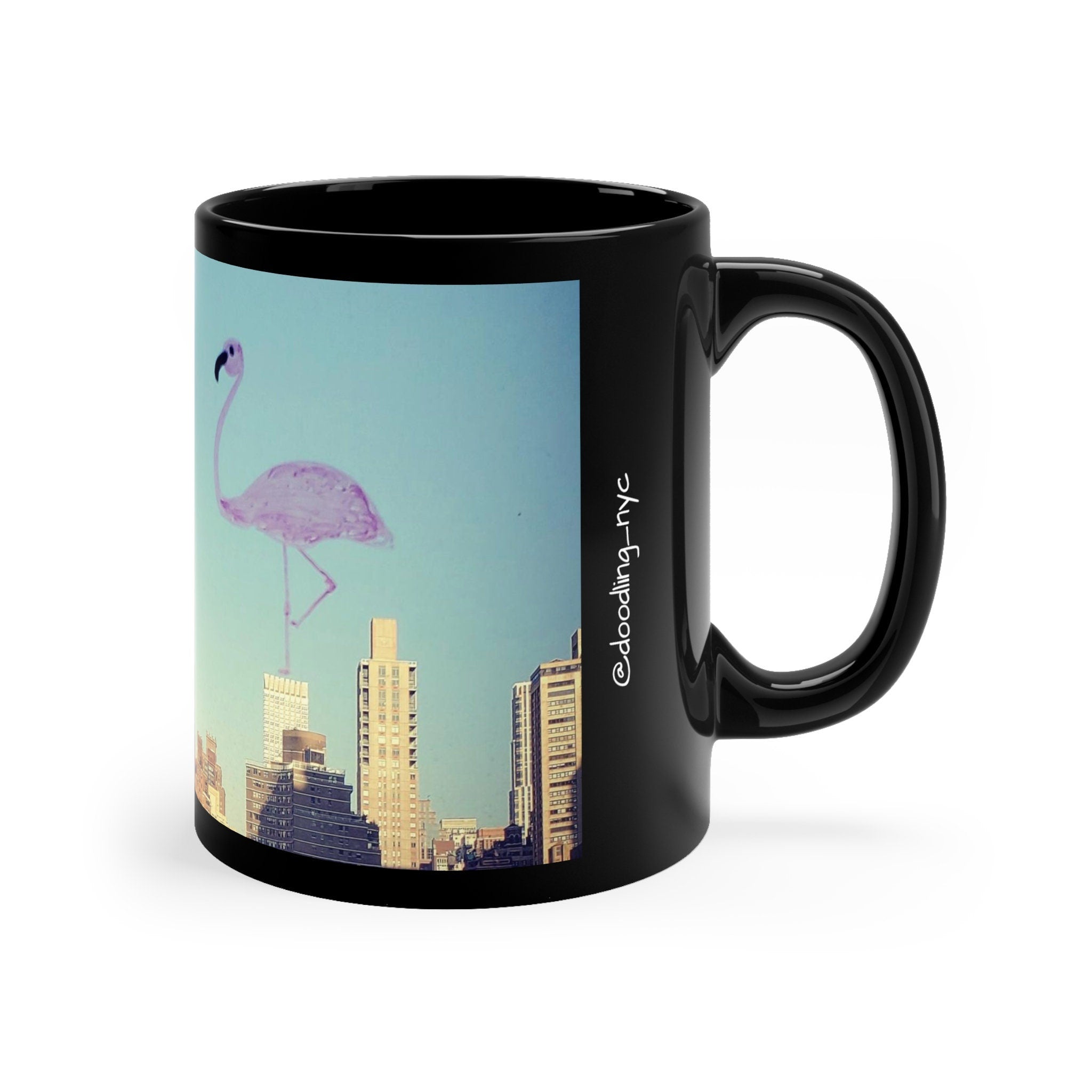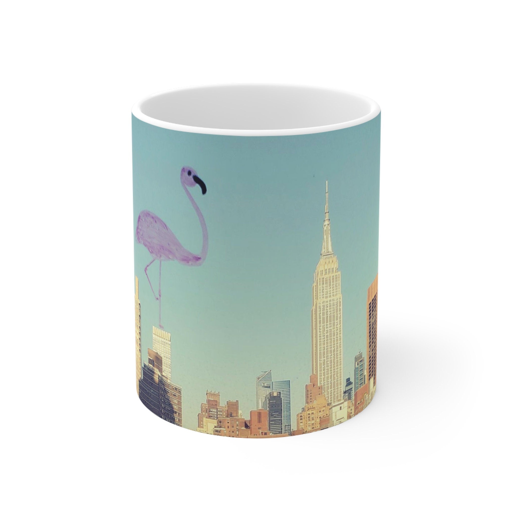 NYC Skyline Flamingo Doodle Mug, USA State Travel Coffee Mug, nyc Flamingo Lover Mug, Aesthetic Artsy Glossy Ceramic Mug, USA Gifts