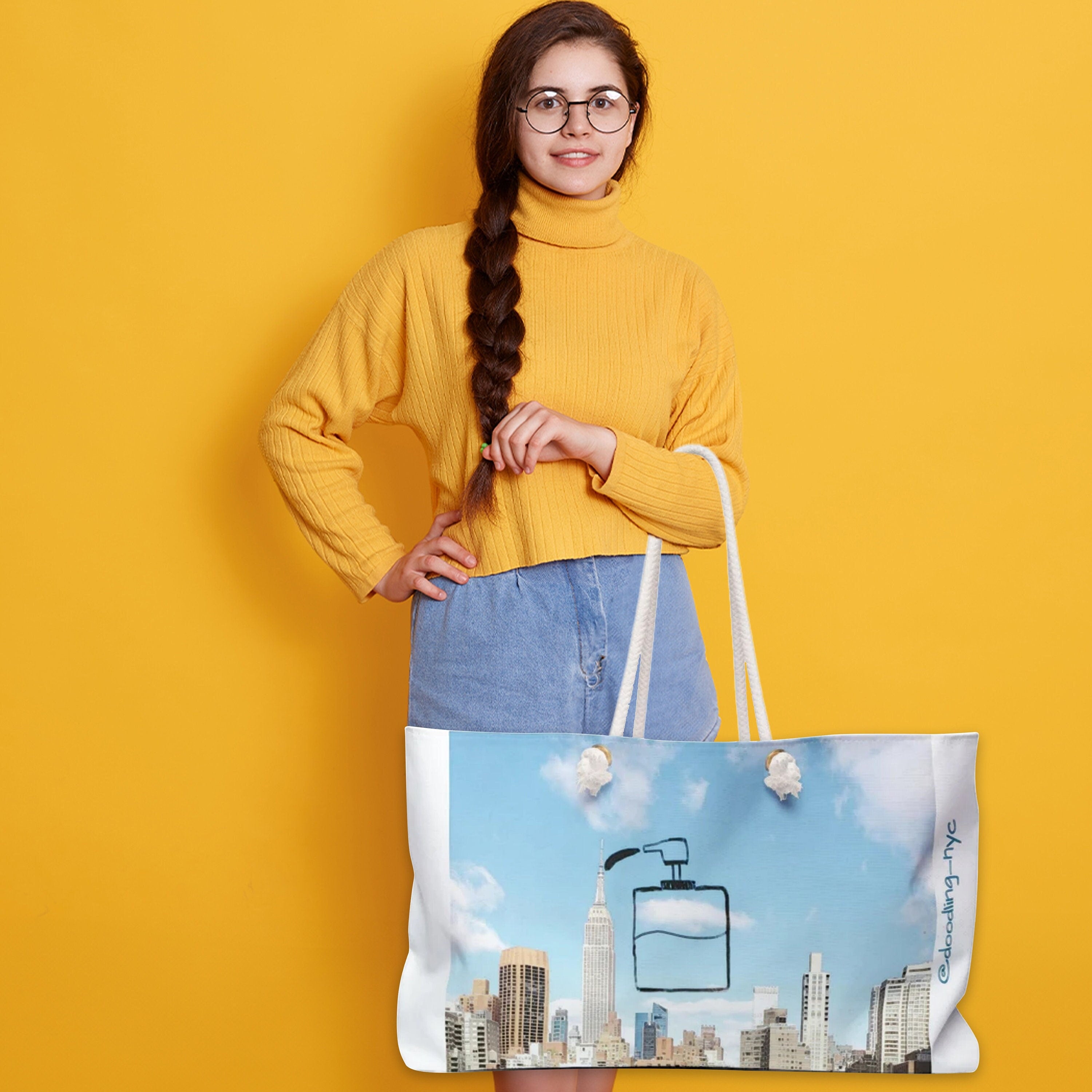 The wide-mouthed, durable bag holds a generous amount of personal items and is easily held by its thick rope handles.